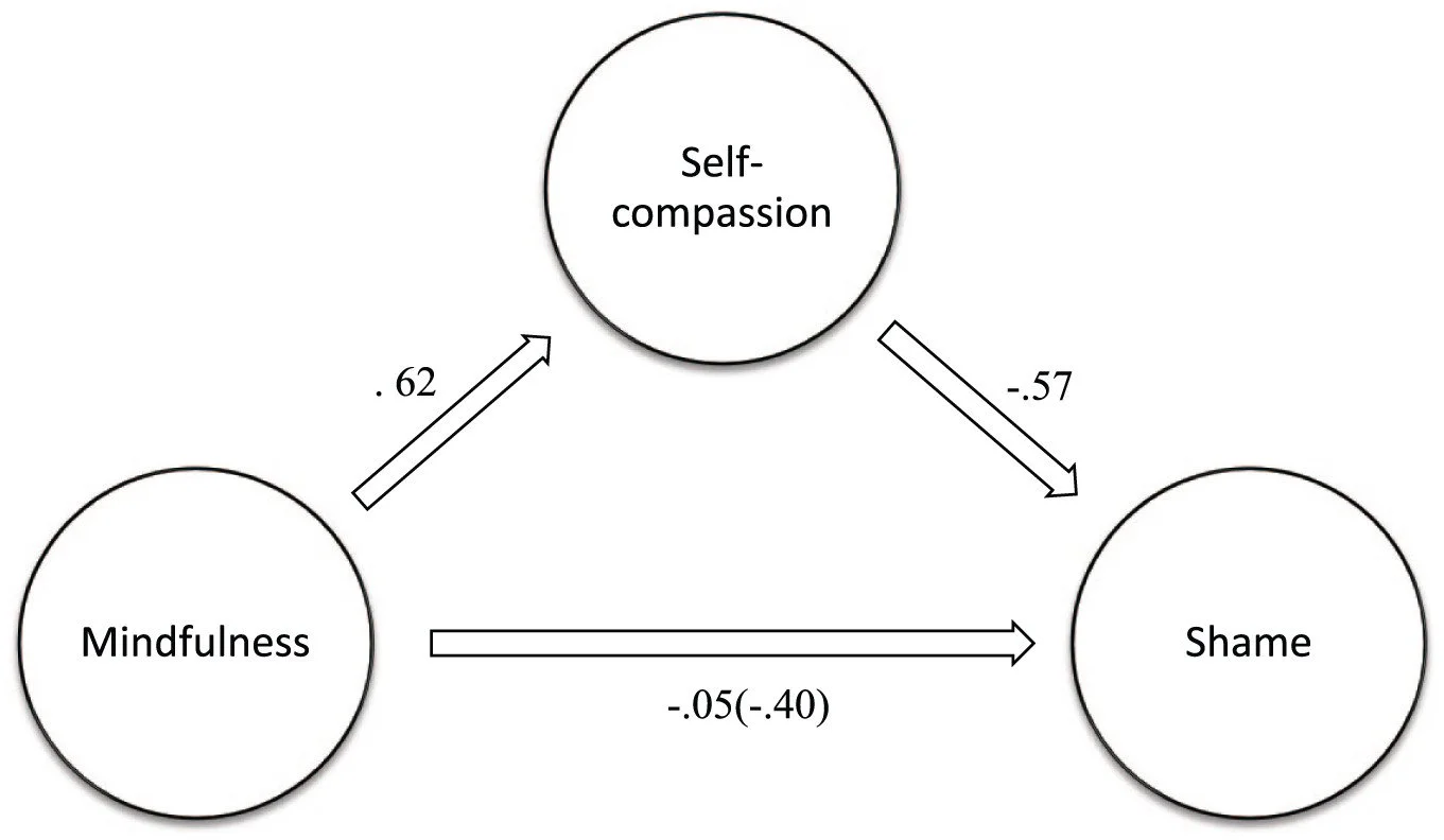 Note. Values on arrows represent standardized beta coefficients: value within parenthesis is the direct effect of mindfulness on shame.